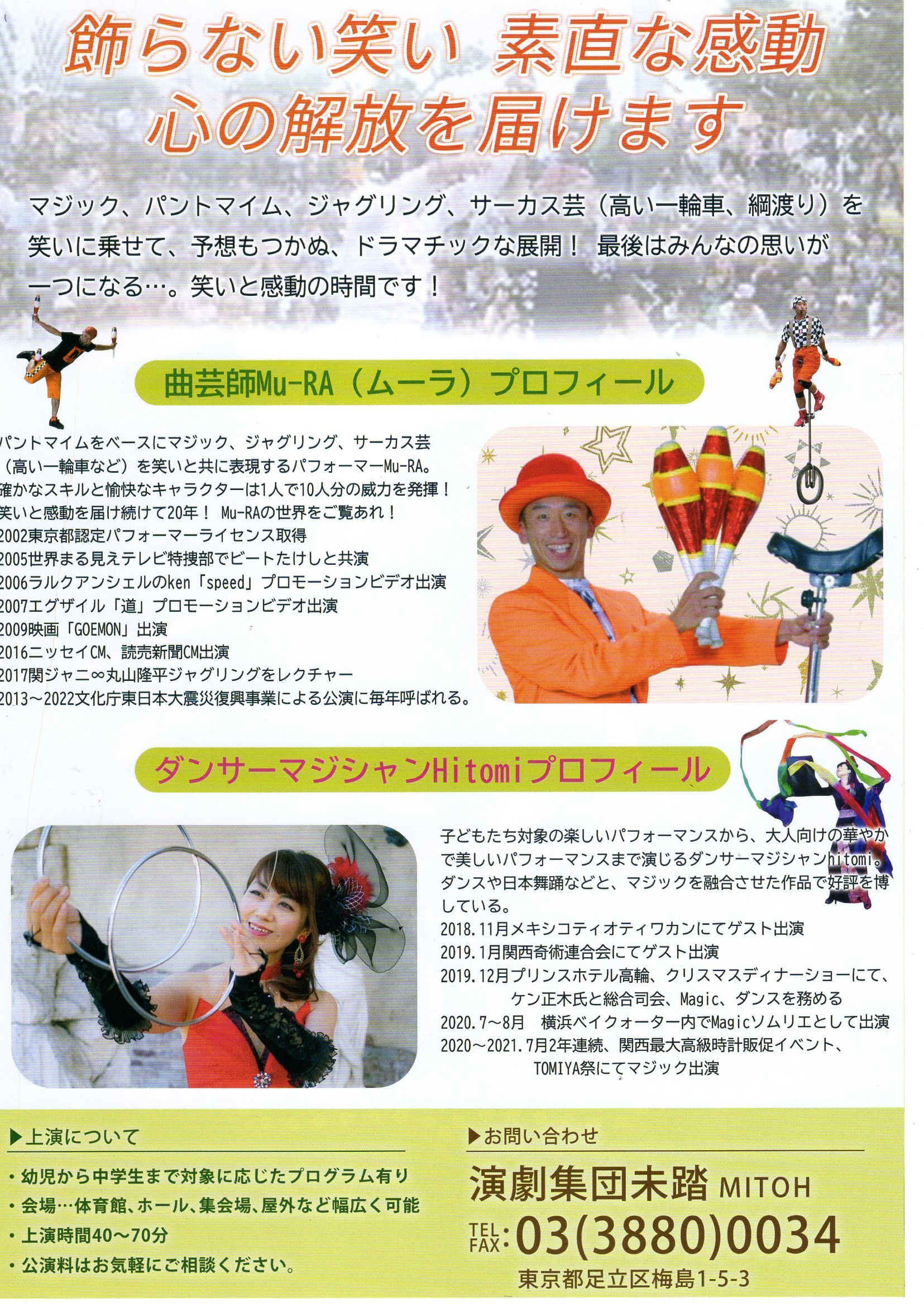 未踏の名前で活動を始めて以来(1966~)常に今を意識した作品創りを続けて来ました。何とも不器用な世間の渡り方ではありましたが、どうにか一貫性を失わずに進んできたように思われます。楽しく、わかりやすく、そうして少しでも何かの、誰かのお役に立てる芝居をとそれ一筋に、悪戦苦闘の連続でした。猪突あり牛歩ありで、振り返ってみるとここ10年に5つの作品が上演されています。それぞれ5年から10年、それ以上継続するものですが、新しい世紀にもう一つ踏み入れる作品を生み出していく地歩ともなっていると自負しています。どうぞ現在上演中の3作品、いずれなりともご検討くださり上演の機会をお与え下さいますようお願い致します。 演劇集団 未踏 代表 立川雄三